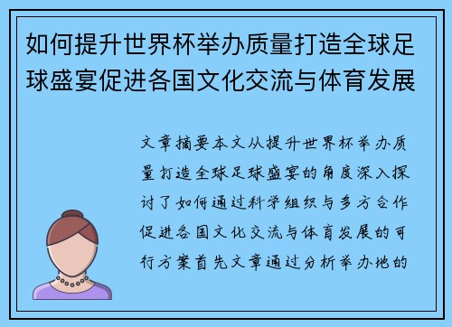 如何提升世界杯举办质量打造全球足球盛宴促进各国文化交流与体育发展