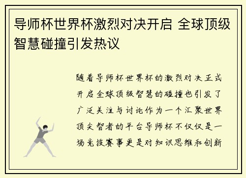 导师杯世界杯激烈对决开启 全球顶级智慧碰撞引发热议